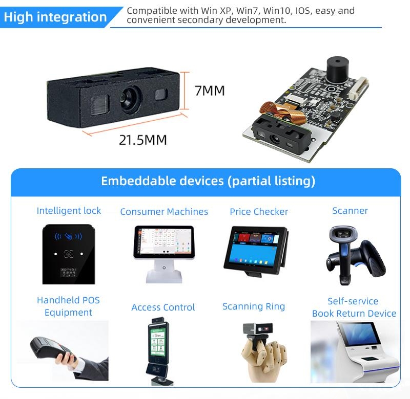 The embedded code scanning module is a self-sensing QR code scanning module that can be integrated into various devices. It has a wide range of application fields, especially playing an important role in self-service machines, all-in-one machines, payment machines, ticket machines, consumer machines, queuing machines and other types of machines that require embedded code scanning. These modules usually have the characteristics of complete scanning code system, whether it is paper barcode or mobile payment code, it can be easily scanned.